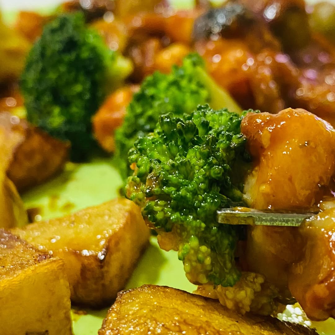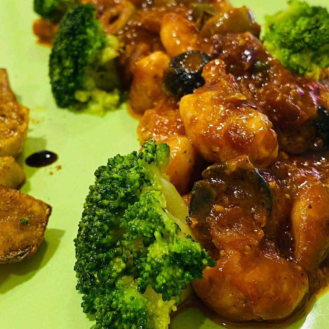 Camarones salteados en salsa roja, gratinados con queso mozzarella, acompañados de brócoli fresco, aceitunas y papas doradas.