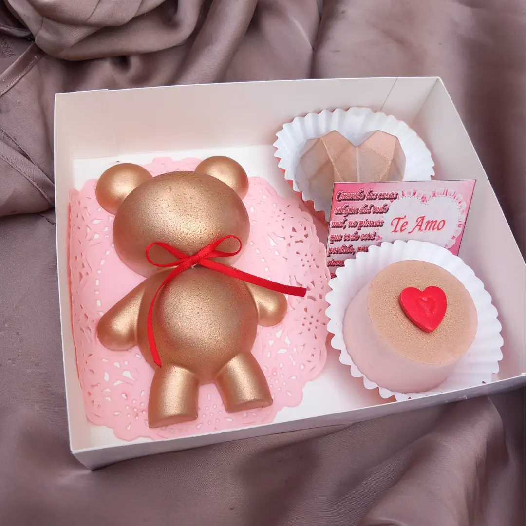 - Teddy bear con corazón geométrico y galleta cubierta de chocolate