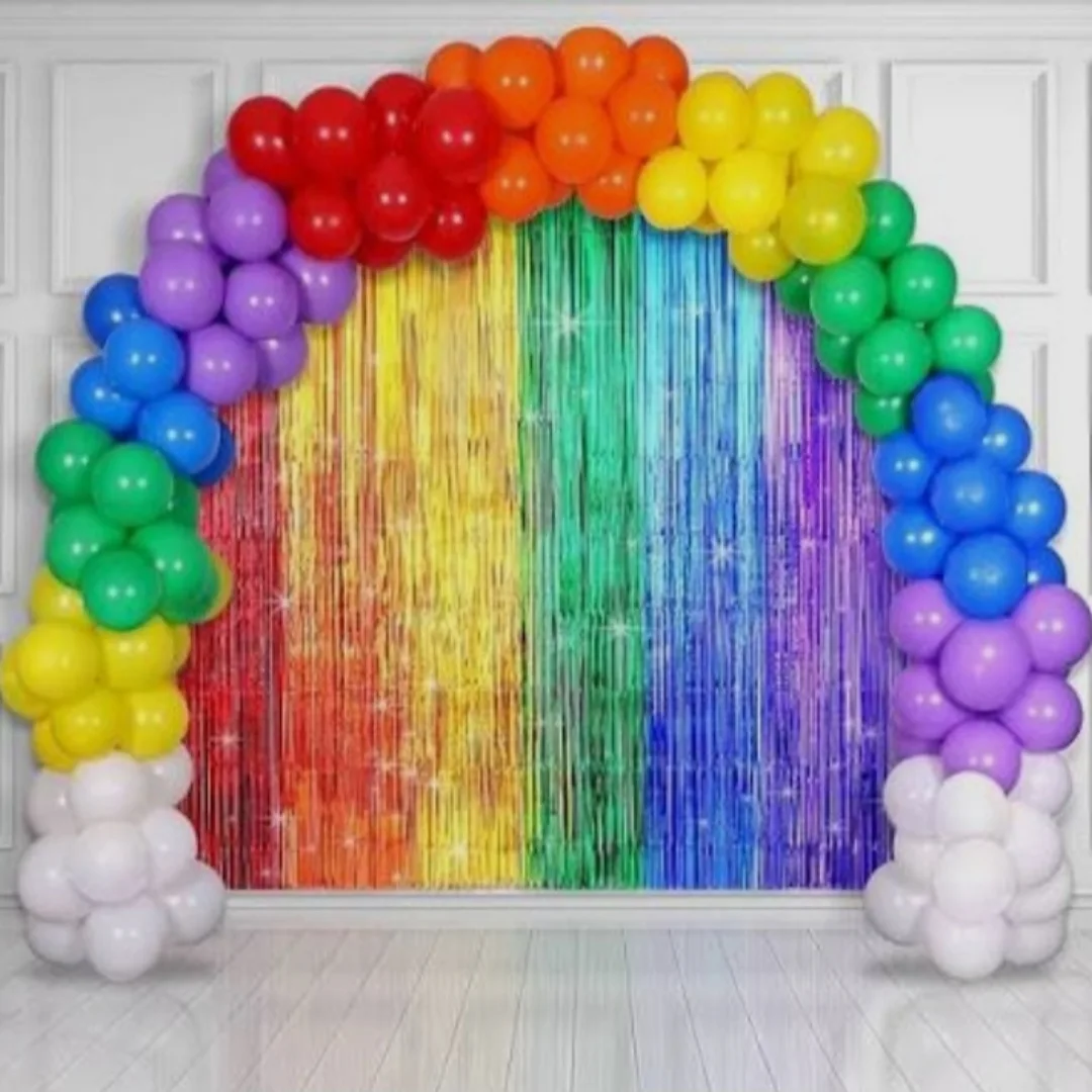 Globos multicolores que despiertan alegría ? y cortinas de destellos que transforman cualquier espacio en un escenario mágico ✨.