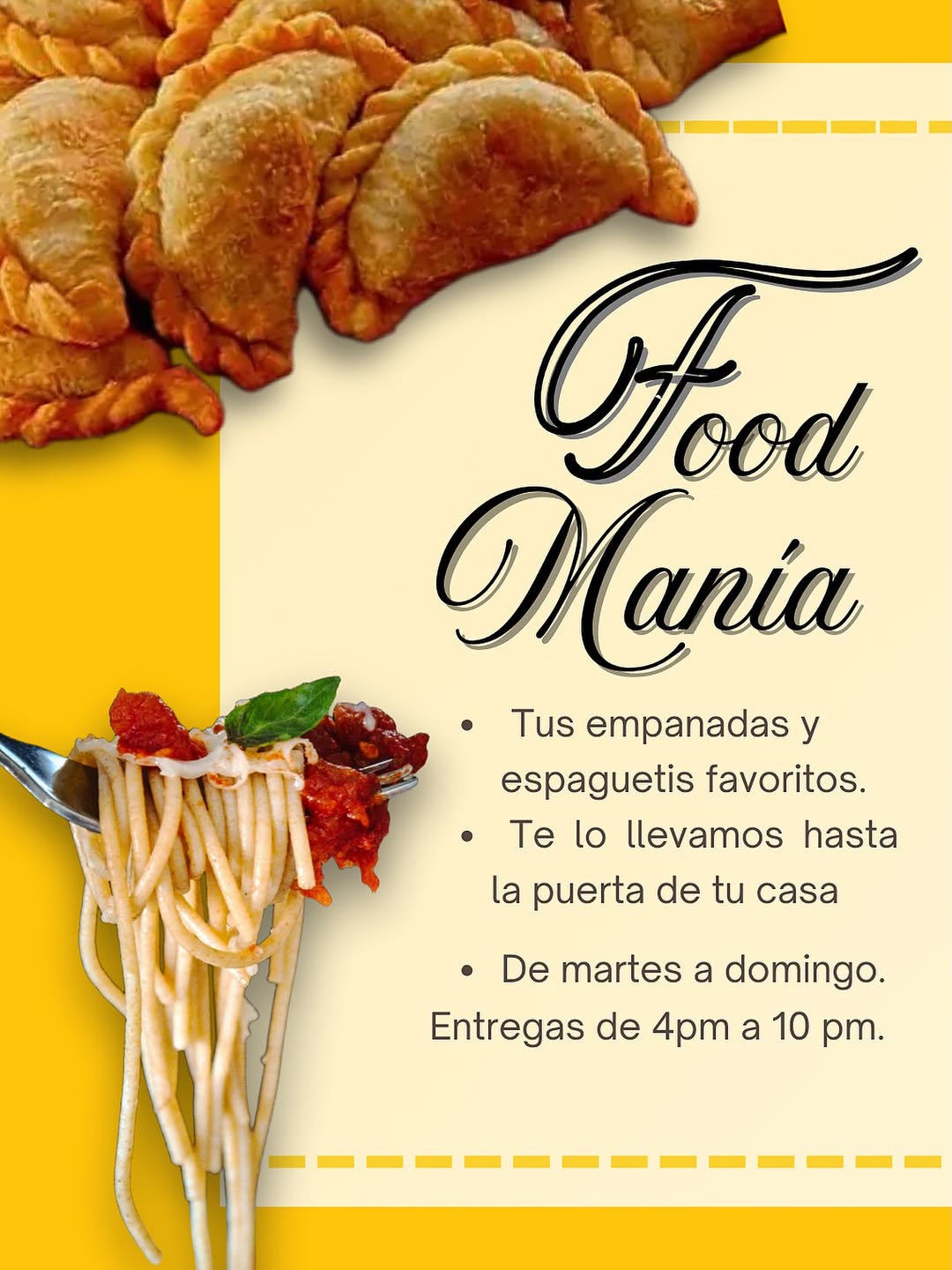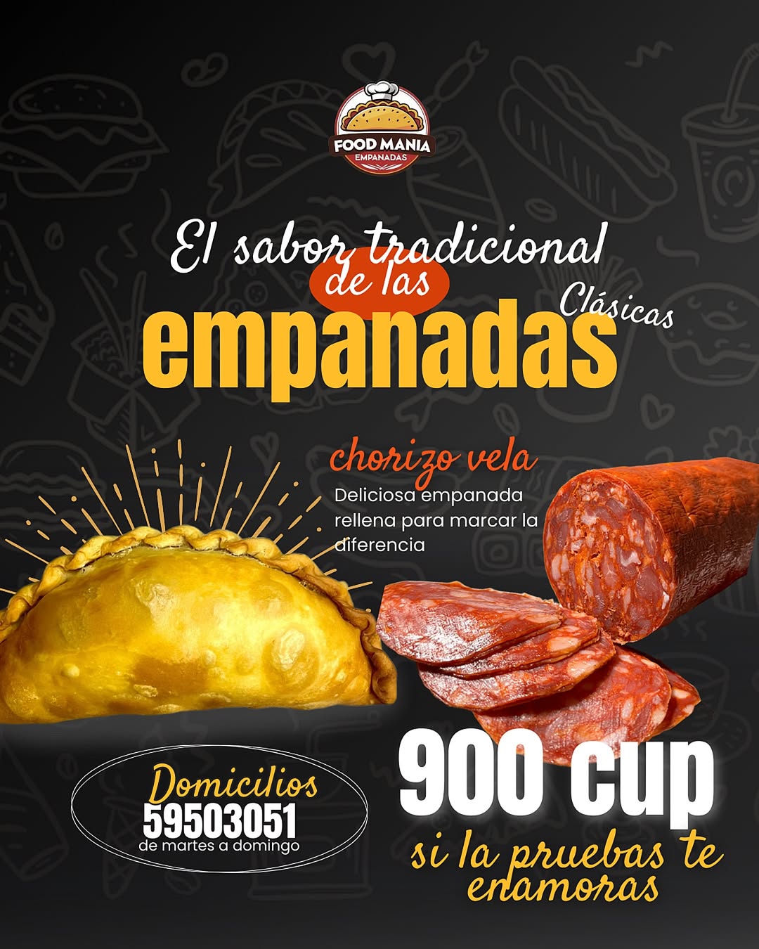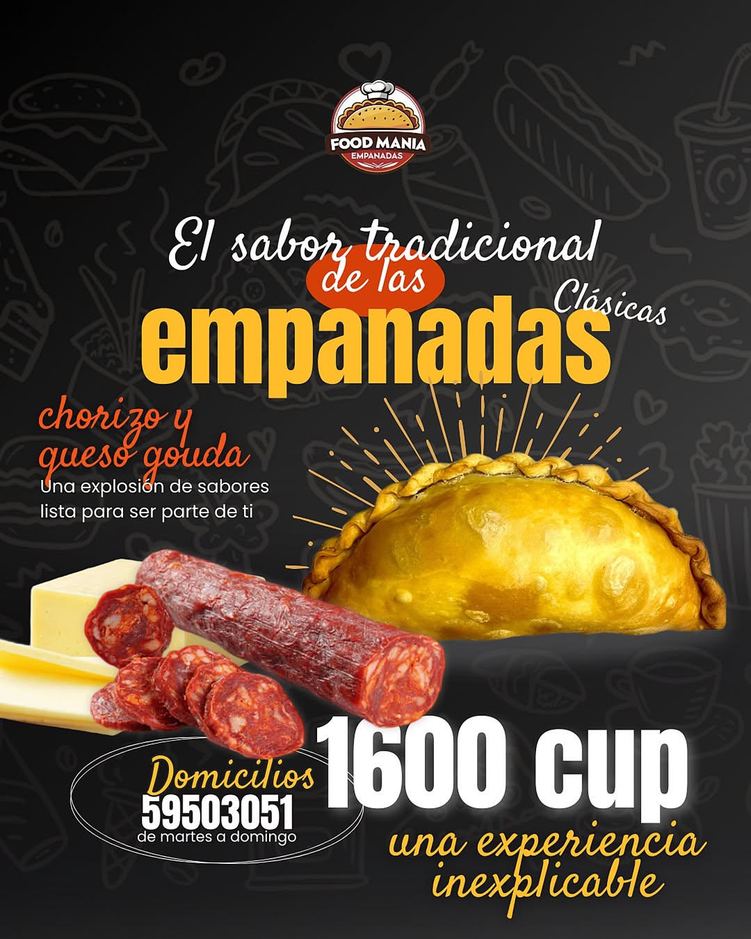 En FOOD MANÍA, hemos redefinido la experiencia de la comida rápida para que la disfrutes con la comodidad que te mereces: donde sea que estés. Nacimos como una cocina dedicada a llevar sabores auténticos directamente a tu puerta, con una pasión que nos define y nos llena de orgullo: la empanada perfecta. Crujiente, sabrosa y hecha con amor, nuestra especialidad es el corazón de todo lo que hacemos y el punto de partida de un sueño que crece con cada pedido.