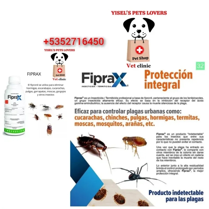 Precio: 250.00 cup 1ml para diluir en un litro de agua. Ligeramente tóxico - Amigable para tu hogar y mascotas ¿Qué es Fiprax? Es un insecticida con un prolongado efecto residual, hecho a base de fipronil. ¿Qué plaga controla F...